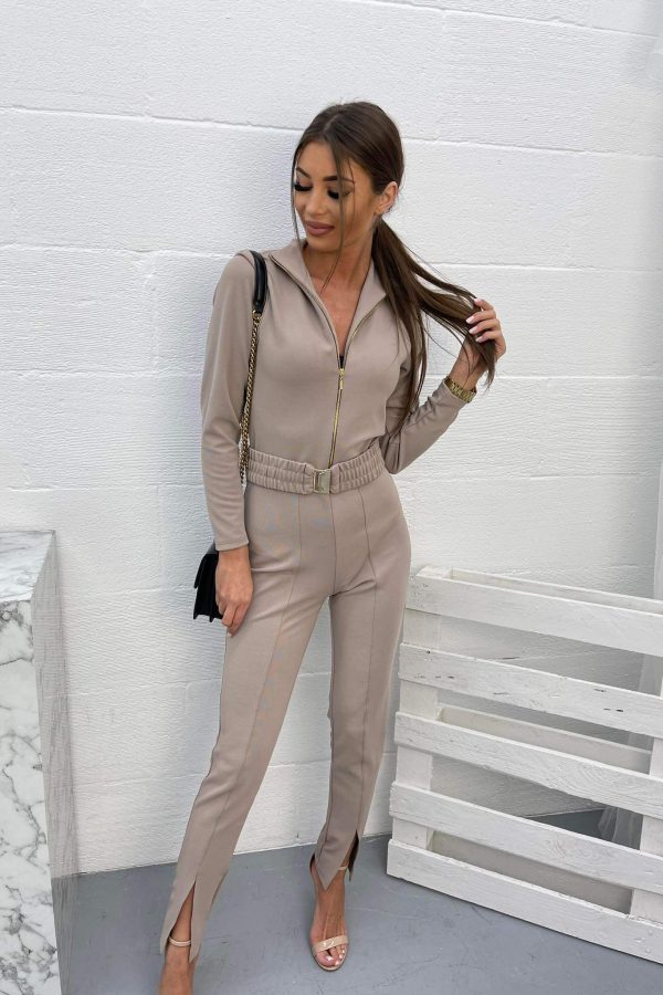 Kombinezon Julia – kombinezon wykonany z wysokiej jakości dzianiny. Modny fason z ozdobnym zamkiem , którym można łatwo regulować głębokość dekoltu. Kombinezon posiada pasek z ozdobną klamrą. U dołu nogawki efektowne rozcięcia.