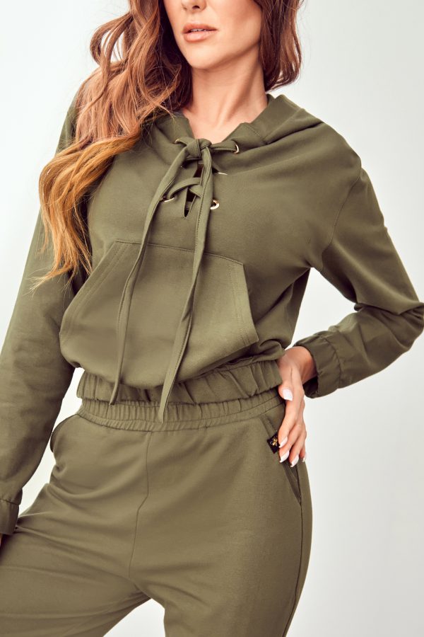 Komplet Laura – komplet dresowy Laura z wysokiej jakości bawełny. Krótka bluza z charakterystycznym sznurowaniem na dekolcie . Spodnie dresowe z wysokim stanem.Idealny wybór na weekendowy wypoczynek. Komplet dostępny w trzech ulubionych odcieniach ( Czarny, khaki, beż)