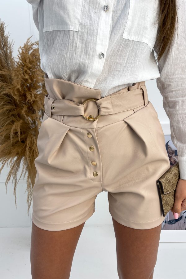 Spodenki Rita – Modny fason spodenek z EKO SKÓRY. Wysoki stan, asymetryczny krój i ozdobne napy nadają oryginalności. Charakterystyczny krój kieszeni i wysoki stan tuszują drobne niedoskonałości, a jednocześnie podkreślają kobiece kształty.