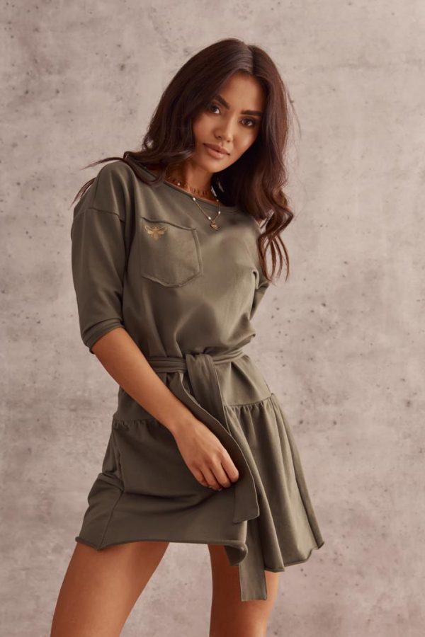 Wygodna sukienka z falbaną. Posiada w zestawie pasek, dlatego można ją stylizować na różne sposoby. Można podkreślić talię tworząc dziewczęcą wersję sukienki lub puścić bez paska i nadać luźny bluzowy kształt. Idealnie pasuje do długiego kozaka ale również sprawdzi się w sportowym charakterze ze sneakersami lub trampkami. Sukienka została wyprodukowana w Polsce z polskiej, wysokiej jakości dzianiny.