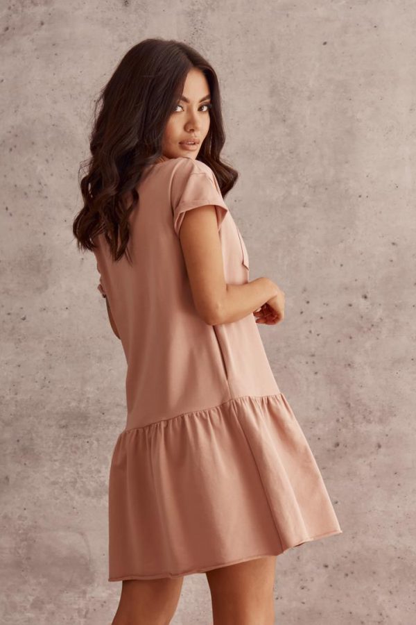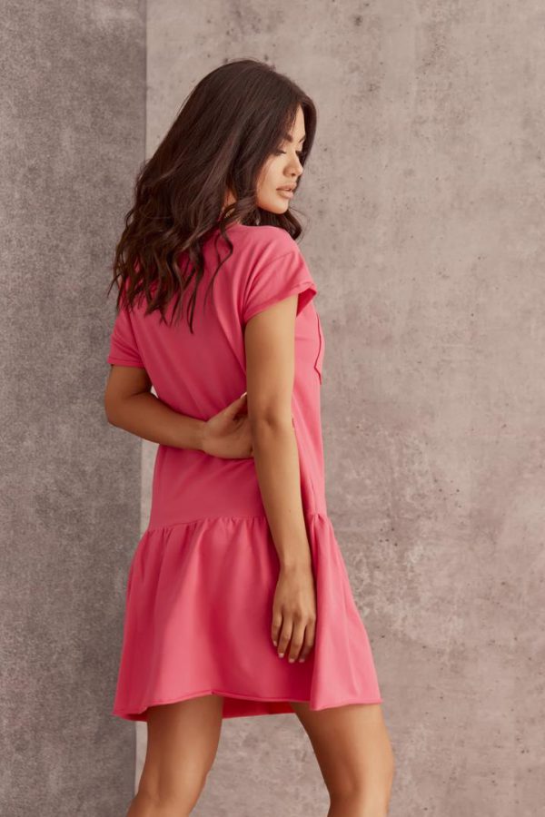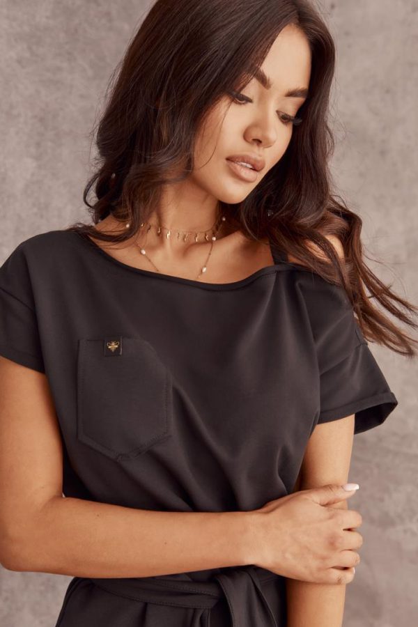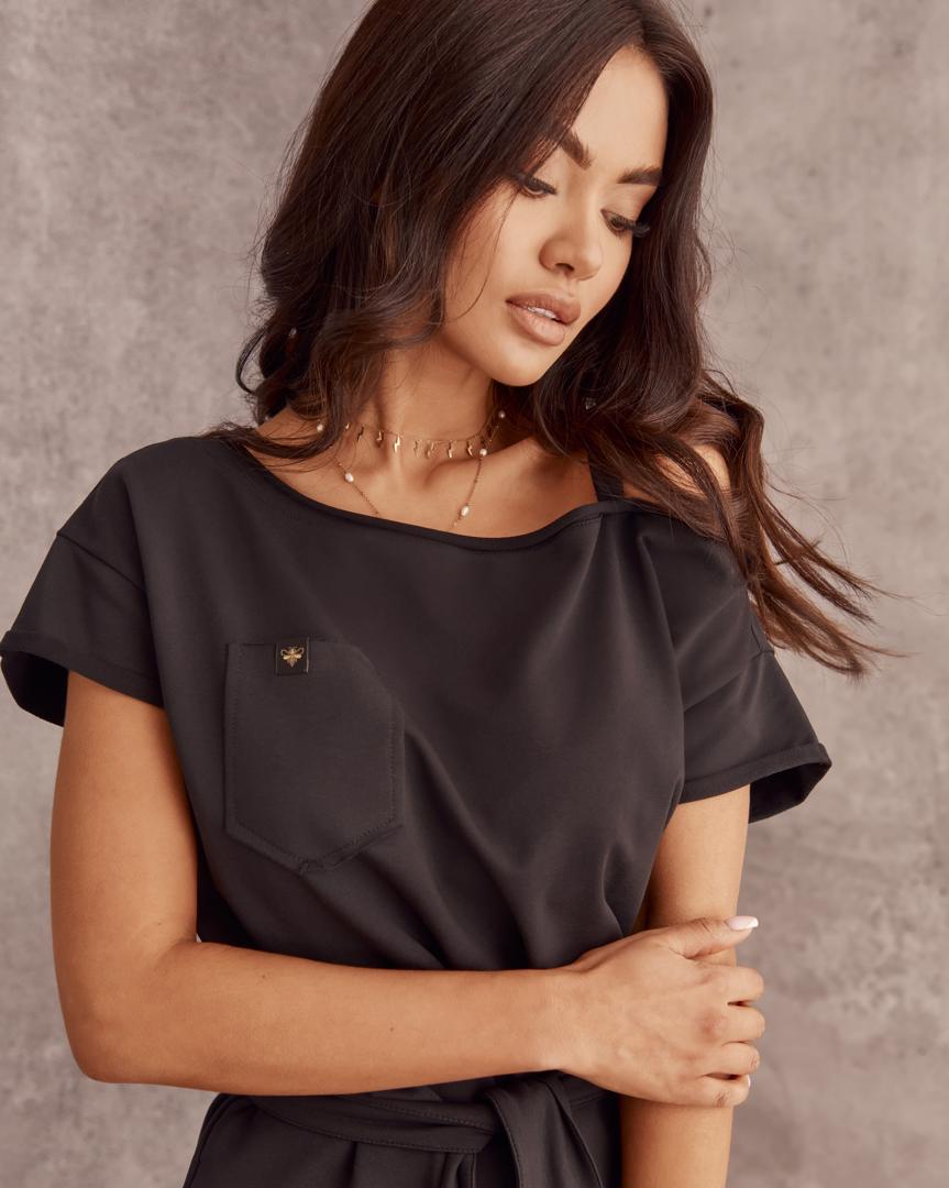 Wygodna sukienka z falbaną i asymetrycznym dekoltem. Posiada w zestawie pasek, dlatego można ją stylizować na różne sposoby. Można podkreślić talię tworząc dziewczęcą wersję sukienki lub puścić bez paska i nadać luźny bluzowy kształt. Idealnie pasuje do długiego kozaka ale również sprawdzi się w sportowym charakterze ze sneakersami lub trampkami. Sukienka została wyprodukowana w Polsce z polskiej, wysokiej jakości dzianiny.